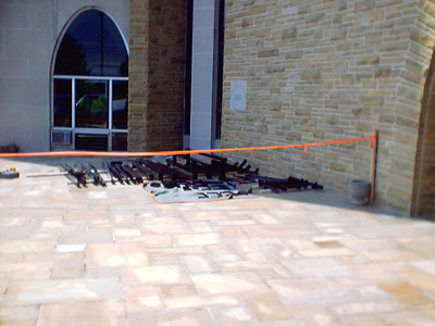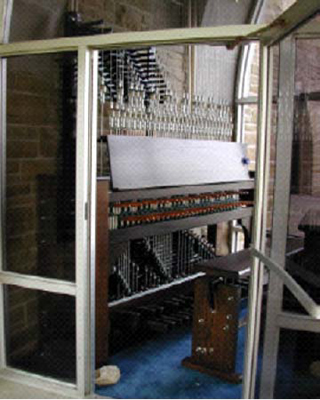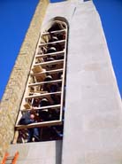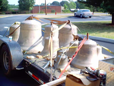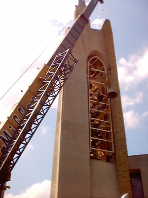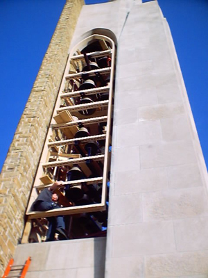 Featured Carillon Projects First Presbyterian Church, Gastonia, North Carolina This instrument was installed in a tower originally envisioned for just three large stationary bells. The steel support structures for these bells, which were integral to the structure of the tower, thus having to remain in place, and the triangular shape of the bell space provided a challenge to the original designers. In 1973, a 49-bell carillon was installed by the Eijsbouts firm of The Netherlands. The design worked out at that time was interesting visually, with the bells arranged in two planes, aligned with the large arched openings; however the design was also problematic from the start in practical ways: In order to miss the large “Y” support structures, the downwires were pulled together into two bunches, and then moved back to their original spacing, using wooden guides with metal staples, a cause of much friction and squeaking noises. The fact that the wire array above the keyboard was some wider as designed than the available space between the tower walls meant that the lowest and highest wires rubbed on the stonework; and the fact that the bell lips projected well beyond the perimeter of the structure prevented the installation of bird screens, resulting in an instrument impossible to properly maintain. In approaching this project, we realized early on that an entirely new design would have to be made, to solve these several serious problems. Thus, after considerable study we planned a rearrangement of the bells, retaining some elements of the visual design, but moving all bells inward to permit placement of bird netting in the tone openings of the tower. We were able to establish rows of bells parallel with the wire plane, for a more effective action design. It was also necessary that none of the existing original steel structures interfered with any new downwire positions; a solution for that, and the necessity of limiting the length of the main wire plane were addressed using the inventive solution of establishing two separate wire planes through the bell chamber, down to a set of transfer bars for the bass action located just above the new playing keyboard. New radial action was installed for all bells, and new ball bearing headpieces, cast iron ball clappers and stainless steel bell support bolts were provided. A new practice keyboard was also built, which is located in the choir room. We also provided a new electric swinging ringer for the original church bell, mounted in the tower above the carillon; and reconditioned the electric strikers for the Westminster and hour strike. The instrument was reinstalled and rededicated in 2002, with a recital by Music Director and Carillonneur Mary McFarland.