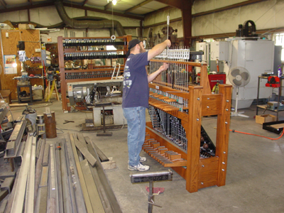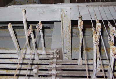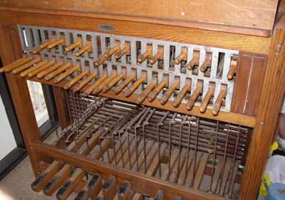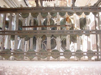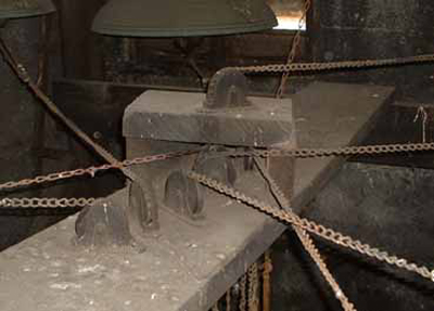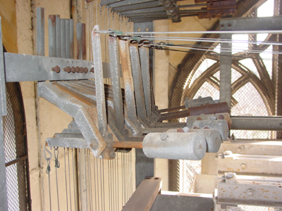 Pulley chime actions are found to be deteriorated, as are cable, chain and wooden rod type chime connections; while replacing pulleys with our latest type, incorporating sealed stainless steel ball bearings in a special radial mount, rotted and cracked wood pulley shelves are replaced with a custom designed structural steel pulley frame, giving also the opportunity of improving pull lines providing a better playing touch.