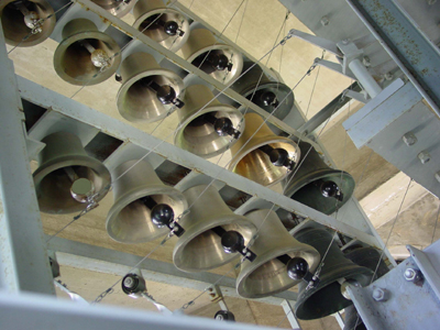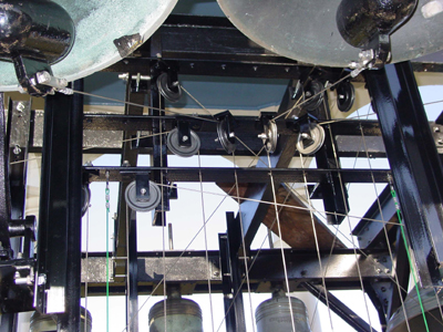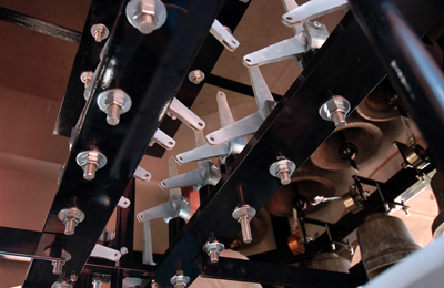 We are also able to improve placment of bells, for both acoustic and mechanical (action) improvement, at the same time, and this applies very much also to carillons. Improving bell arrangements in new bell frames can result in great gains in terms of action sensitivity at the keyboard. An example is where original bell locations require excessively long clapper wires which droop and “gallop”, resulting in poor control for the carillonneur.